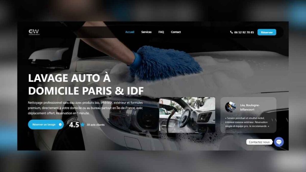 Clean & Wash Catégorie Site de réservation Date Septembre 2025 Service proposé Site web & identité visuelle Lien du site https://cleanandwash-idf.com/ Description du projet Cette réalisation repose sur un template RM Webstudios retravaillé pour Clean & Wash, une entreprise spécialisée