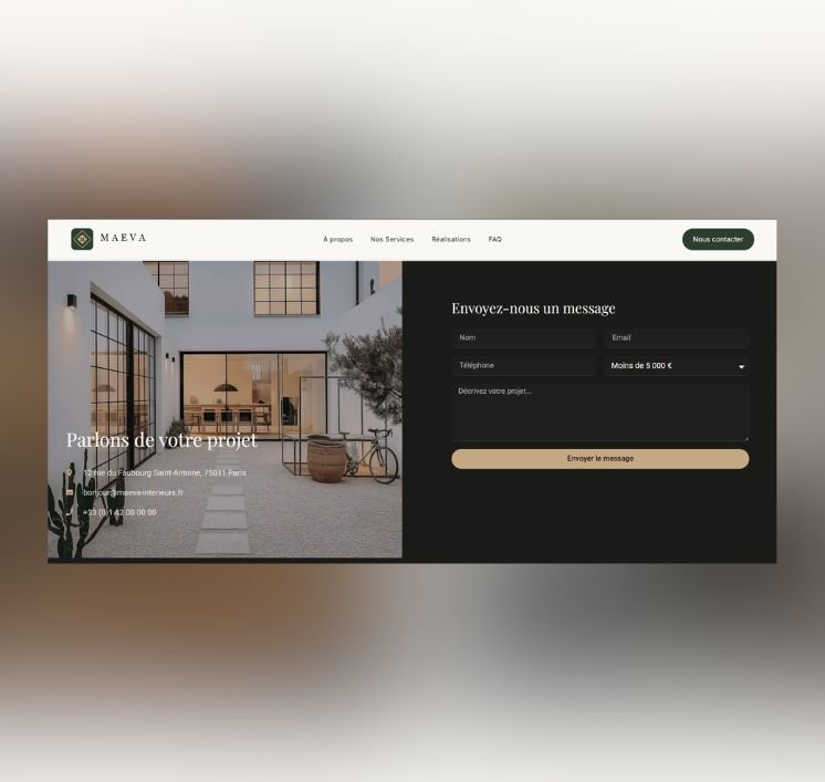 Attirez des clients et décrochez des projets avec un site qui reflète votre savoir-faire. Maeva Intérieurs est une landing page WordPress clé en main, pensée pour les décorateurs et architectes d'intérieur qui veulent se démarquer et convertir leurs visiteurs en clients.